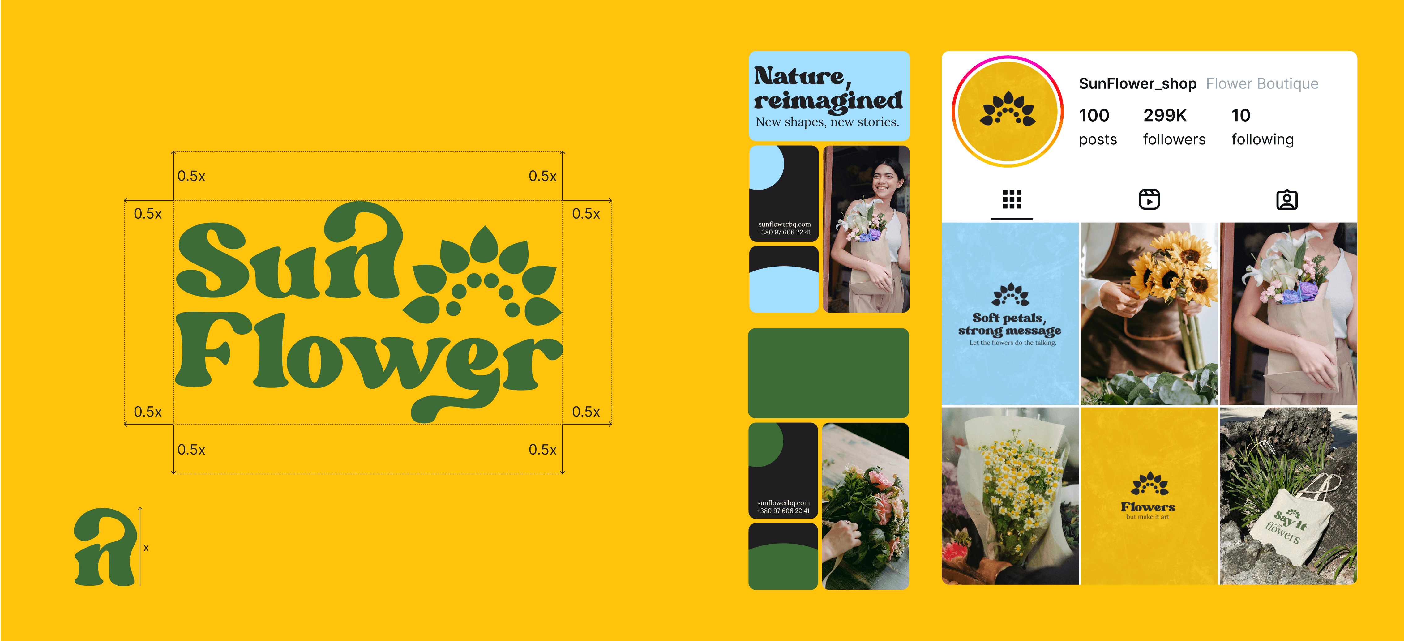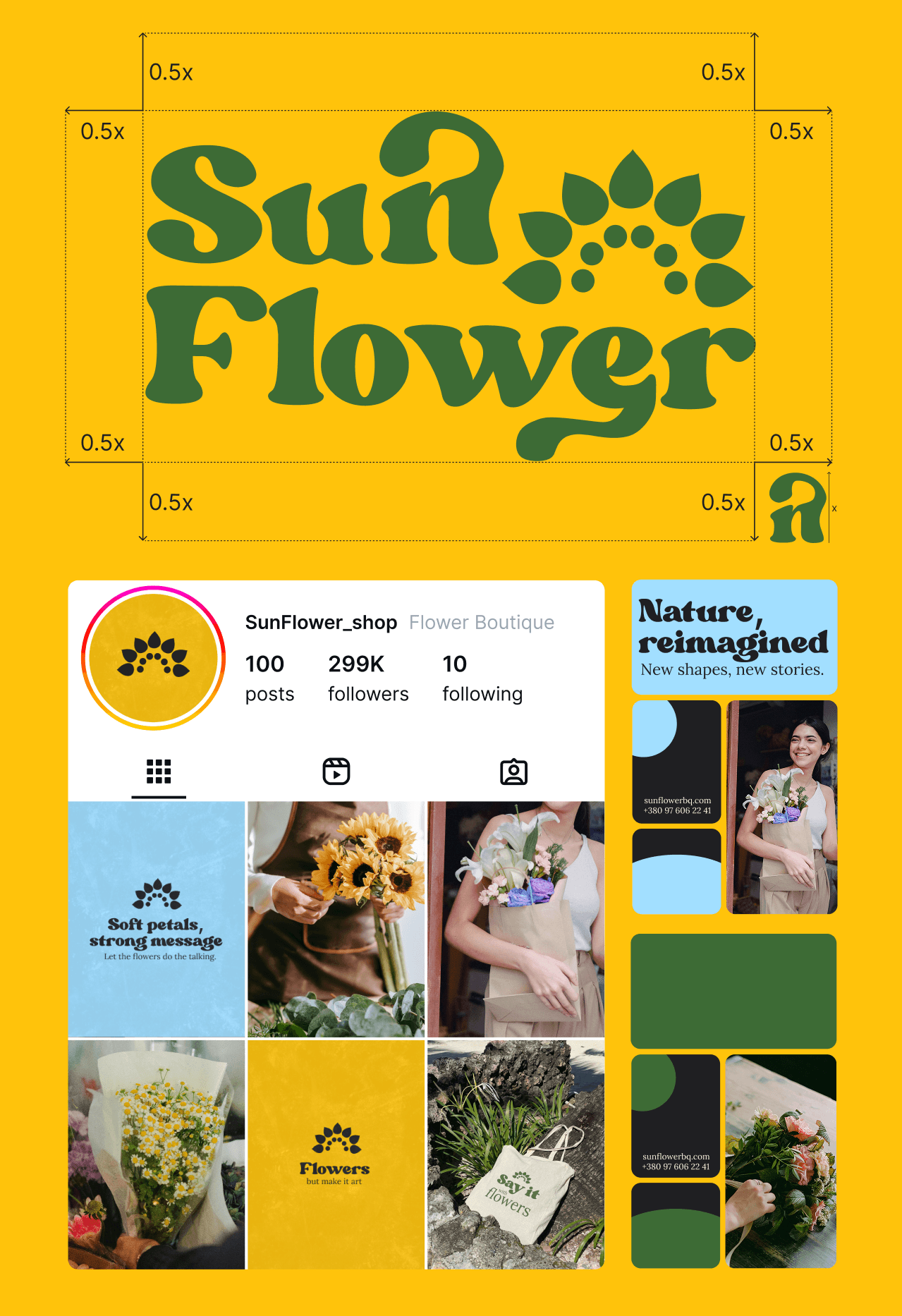I wanted the logo as lively as Sunflower’s arrangements, so I sketched loose, petal‑shaped letters until the word bloomed. A half‑sun icon grew from those pages and now works solo on stickers, wraps, and profile pics. Bright yellow leads the palette, grounded by earthy brown and leaf green. I refined the clearest sketch on screen, added a playful ligatures, and tested it from storefront signs to tiny care cards and motion posts. The system scales effortlessly and stays sunny everywhere.